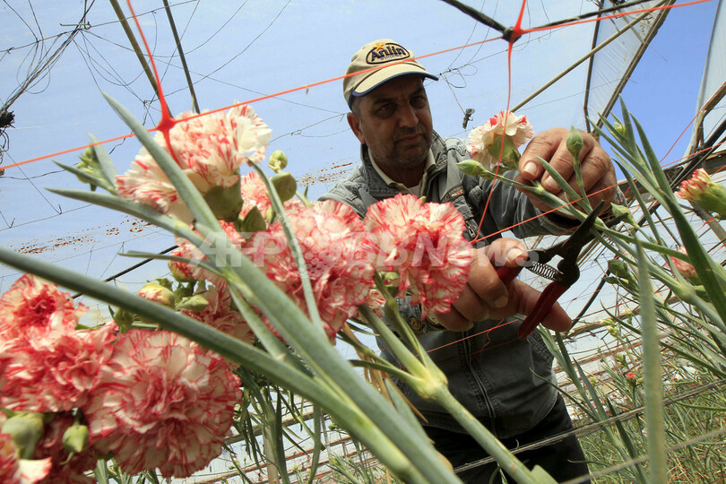 写真は、ガザ地区南部のラファ(Rafah)で、咲いたカーネーションを摘む花栽培農家の男性(2013年4月25日撮影)。(c)AFP/SAID KHATIB