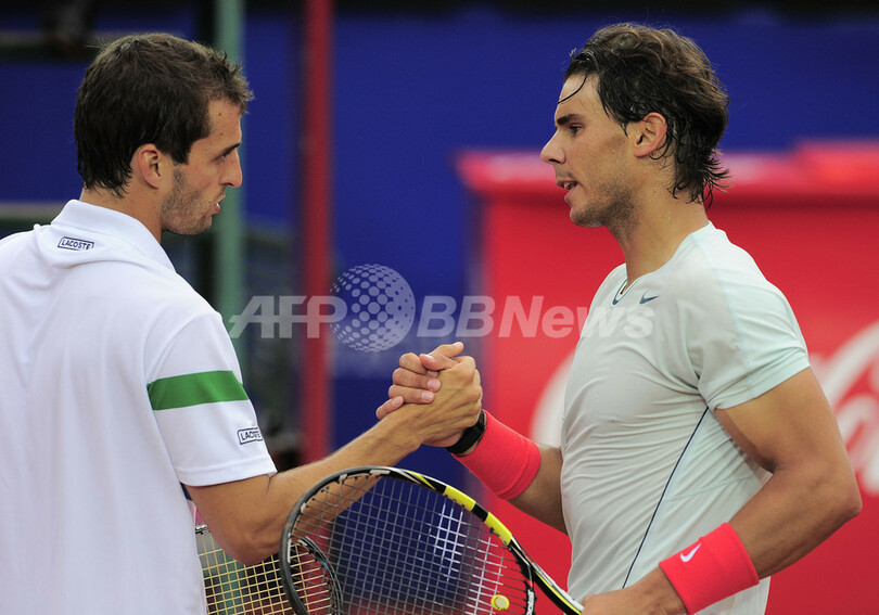 試合を終えて握手をかわすアルバート・ラモス(左)とラファエル・ナダル(2013年4月26日撮影)。(c)AFP/JOSEP LAGO
