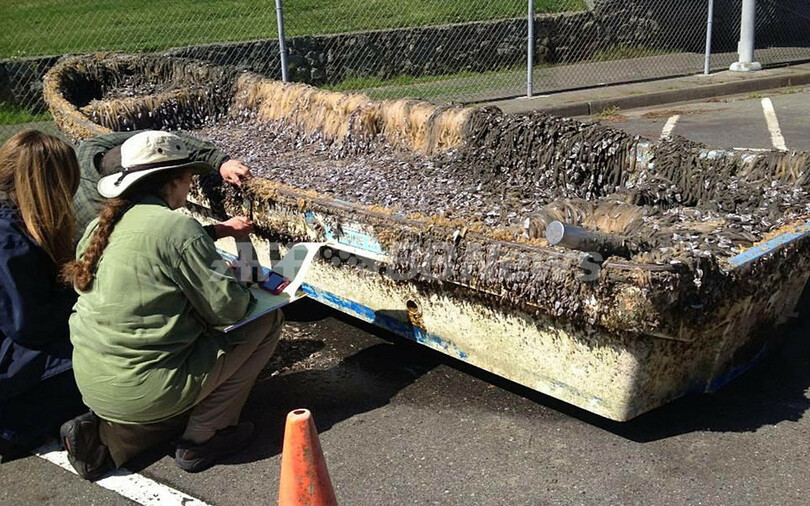 漂着した全長約6メートルの小型ボートは、岩手県陸前高田市の岩手県立高田高校が所有していたものとみられる。(c)AFP
