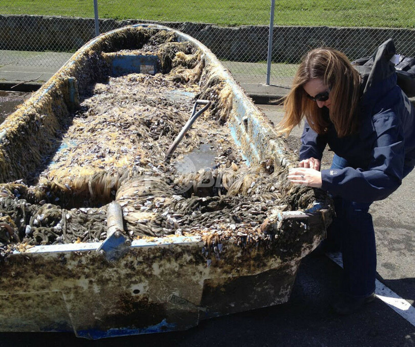 写真は、漂着した小型船に付着したフジツボを調べる女性(2013年4月9日撮影、2013年4月26日提供)。(c)AFP/HUMBOLDT STATE UNIVERSITY/Lori DENGLER