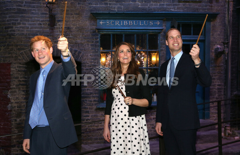 ウィリアム英王子(Prince William)と妻のキャサリン妃(Catherine, Duchess of Cambridge)、弟のヘンリー王子(Prince Henry)は26日、ロンドン(London)郊外リーブスデン(Leavesden)にあるワーナー・ブラザース・スタジオ・リーブスデン(Warner Bros. Studios Leavesden)を訪問し、映画『ハリー・ポッター(Harry Potter)』シリーズのセットなどの展示を楽しんだ(2013年4月26日撮影)。(c)AFP/CHRIS JACKSON