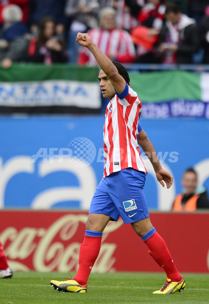 前半3分に先制点を挙げ歓喜するアトレティコ・マドリードラダメル・ファルカオ・ガルシア(Radamel Falcao Garcia、2013年4月27日撮影)。(c)AFP/JAVIER SORIANO