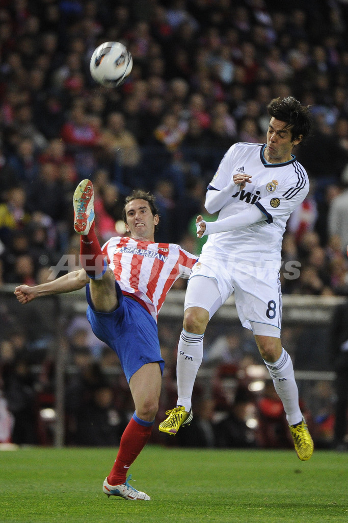 ボールを競るレアル・マドリードのカカ(Kaka、右)とアトレティコ・マドリードのディエゴ・ゴディン(Diego Godin、2013年4月27日撮影)。(c)AFP/PEDRO ARMESTRE
