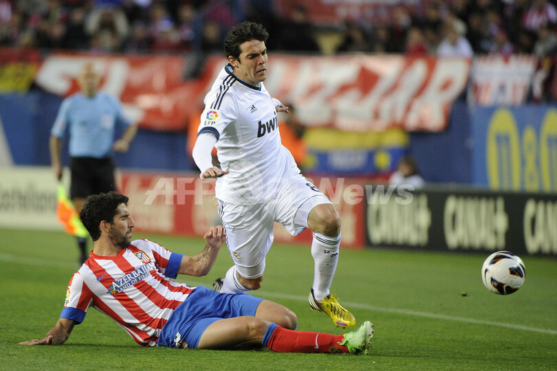 アトレティコ・マドリードのラウル・ガルシア(Raul Garcia、左)のタックルを受けるレアル・マドリードのカカ(Kaka、2013年4月27日撮影)。(c)AFP/PEDRO ARMESTRE