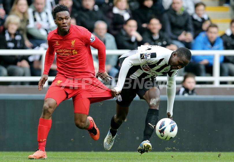 ニューカッスルのマプ・ヤンガ・ムビワ(Mapou Yanga-Mbiwa、右)と競り合うリバプールのダニエル・スターリッジ(Daniel Sturridge、2013年4月27日撮影)。(c)AFP/IAN MACNICOL
