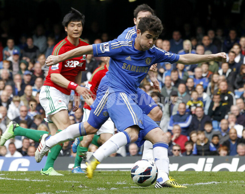 前半43分に先制点を決めるチェルシーのオスカル(Oscar dos Santos Emboaba Junior、2013年4月28日撮影)。(c)AFP/Ian KINGTON