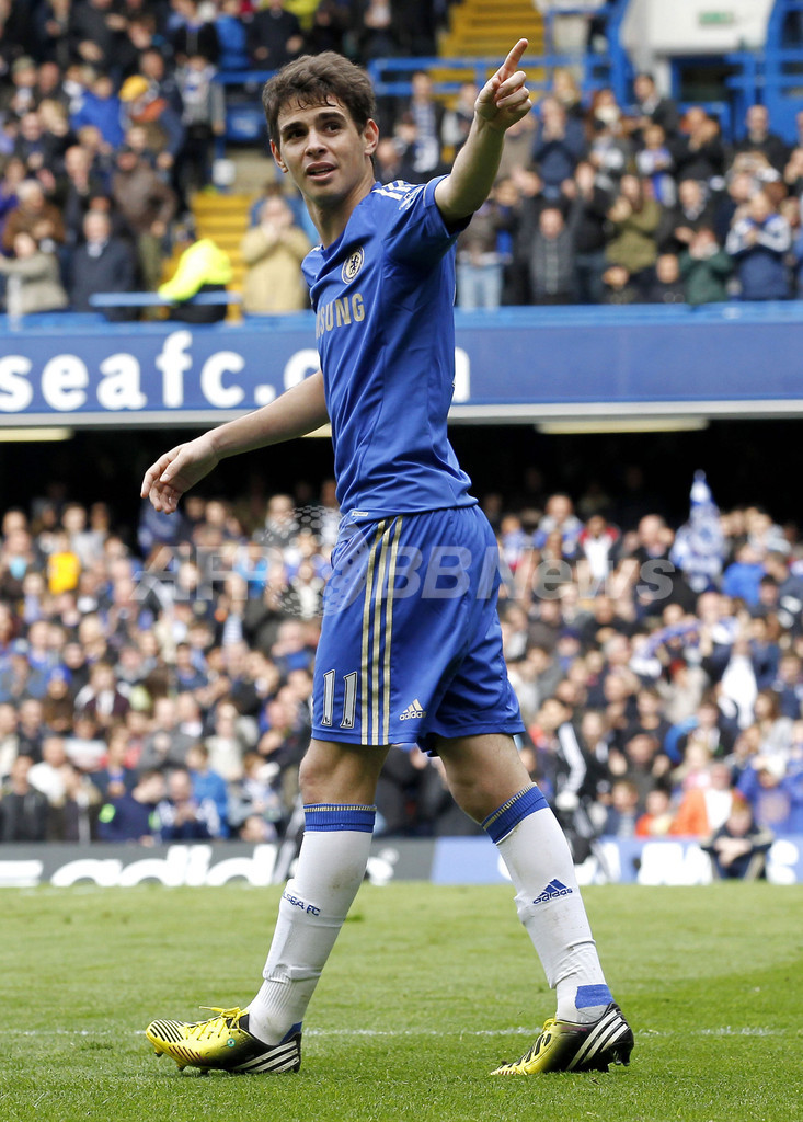 前半43分に先制ゴールを決め喜ぶチェルシーのオスカル(Oscar dos Santos Emboaba Junior、2013年4月28日撮影)。(c)AFP/Ian KINGTON