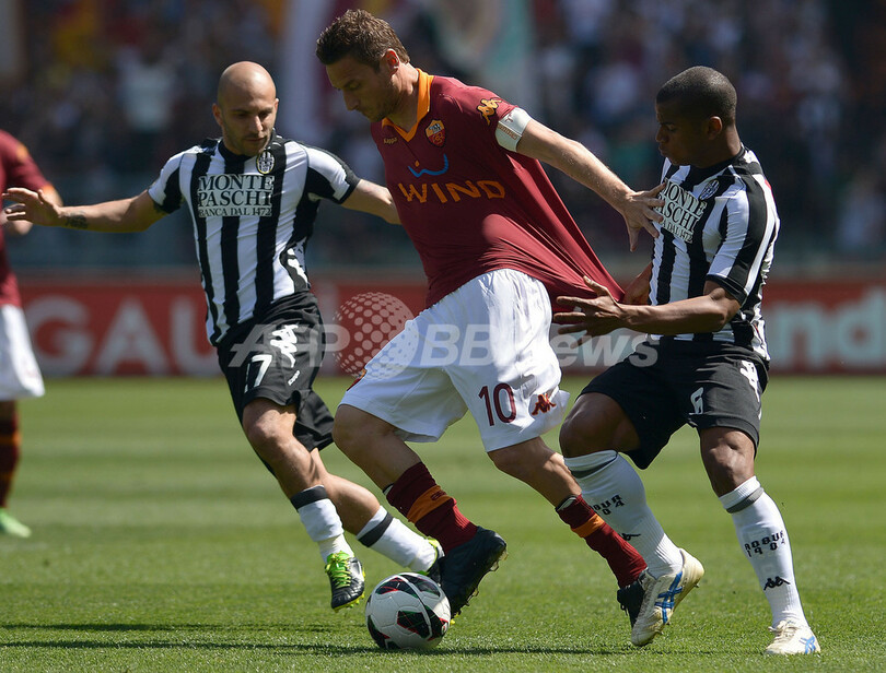 シエナのアンジェロ(Mariano De Almeyda Angelo、右)、アレッサンドロ・ロジーナ(Alessandro Rosina、左)とボールを競るASローマのフランチェスコ・トッティ(Francesco Totti、2013年4月28日撮影)。(c)AFP/GABRIEL BOUYS