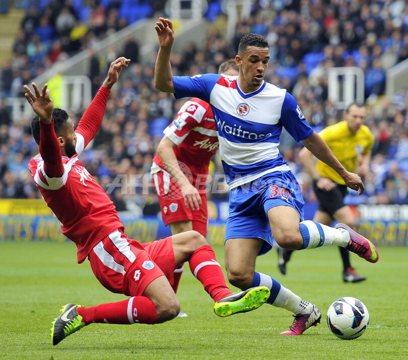 QPRのアルマン・トラオレ(Armand Traore、左)とボールを競るレディングのニック・ブラックマン(Nick Blackman、2013年4月28日撮影)。(c)AFP/Glyn KIRK