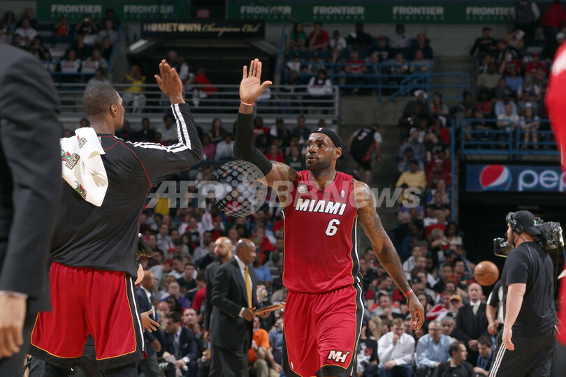 ハイタッチを交わすマイアミ・ヒートのクリス・ボッシュ(Chris Bosh、左)とレブロン・ジェームズ(LeBron James、2013年4月28日撮影)。(c)AFP/Getty Images/NBAE/Gary Dineen