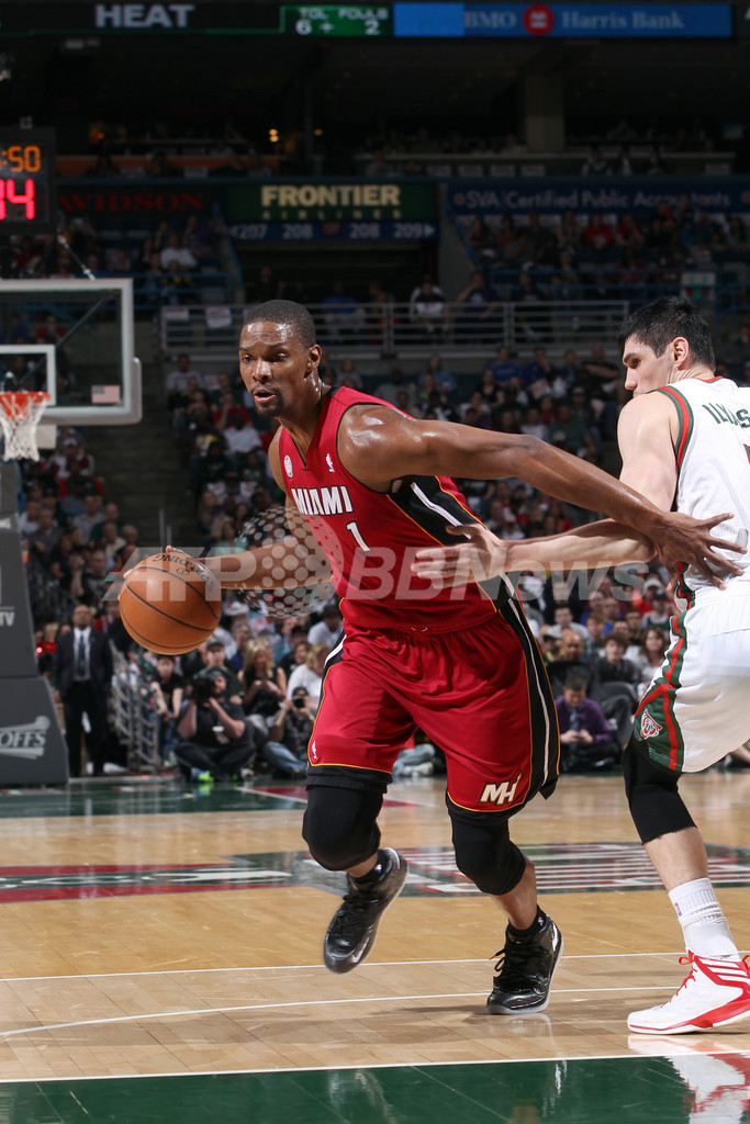 ミルウォーキー・バックスのアーサン・イリャソワ(Ersan Ilyasova、右)にドライブを仕掛けるマイアミ・ヒートのクリス・ボッシュ(Chris Bosh、2013年4月28日撮影)。(c)AFP/Getty Images/NBAE/Gary Dineen