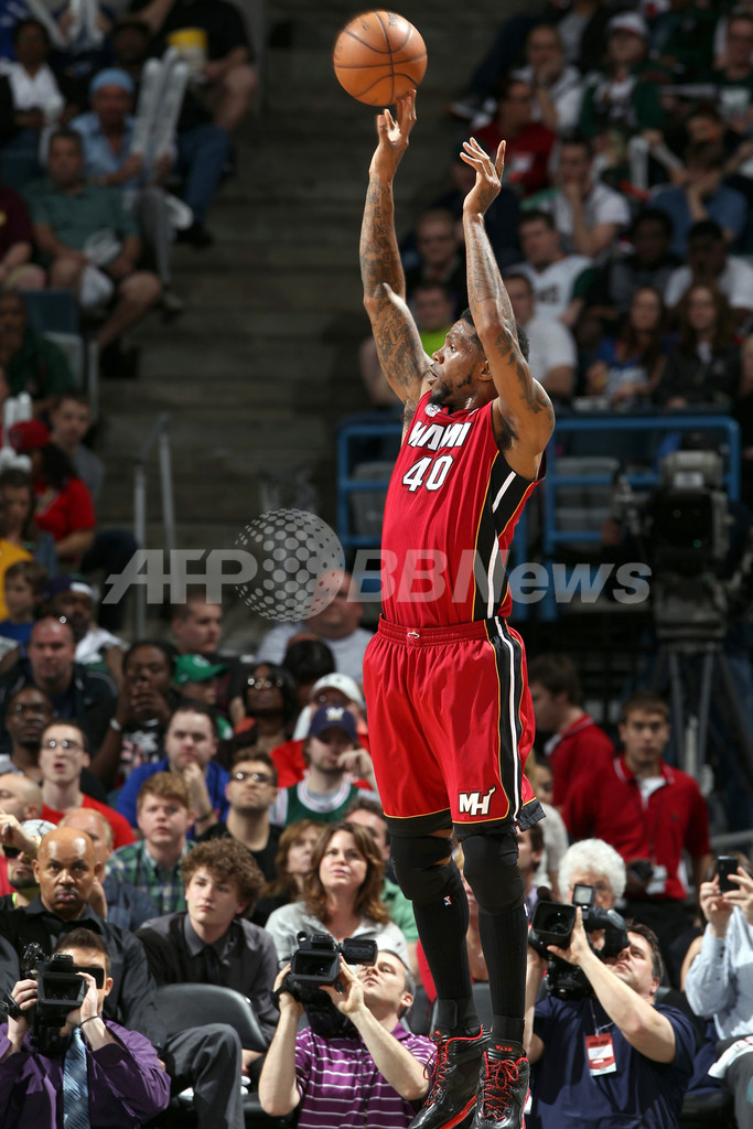 シュートを放つマイアミ・ヒートのウドニス・ハスレム(Udonis Haslem、2013年4月28日撮影)。(c)AFP/Getty Images/NBAE/Gary Dineen