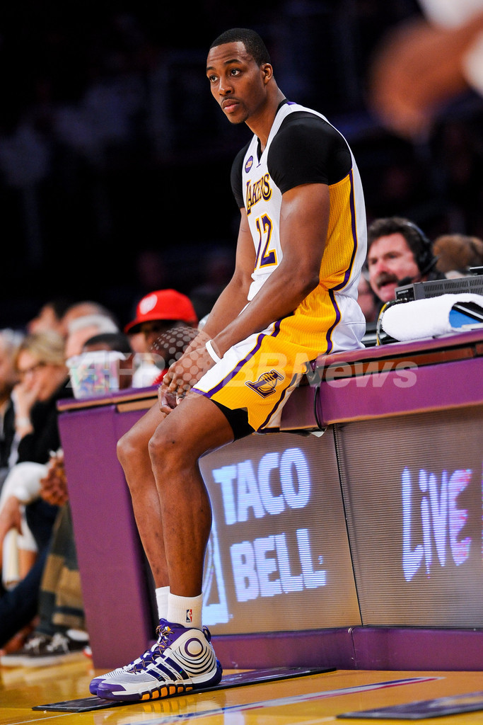 コートサイドに座るロサンゼルス・レイカーズのドワイト・ハワード(%Dwight Howard、2013年4月28日撮影)。(c)AFP/Getty Images/NBAE/Noah Graham