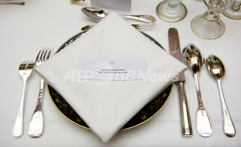 オランダを公式訪問中の皇太子さまは29日夜(日本時間30日朝)、アムステルダム(Amsterdam)市内の国立博物館(National Museum)で開かれたベアトリックス女王(Queen Beatrix)主催の晩餐会(ばんさんかい)に出席された。写真は、皇太子さまのために並べられた食器(2013年4月29日撮影)。(c)AFP/ROBIN UTRECHT