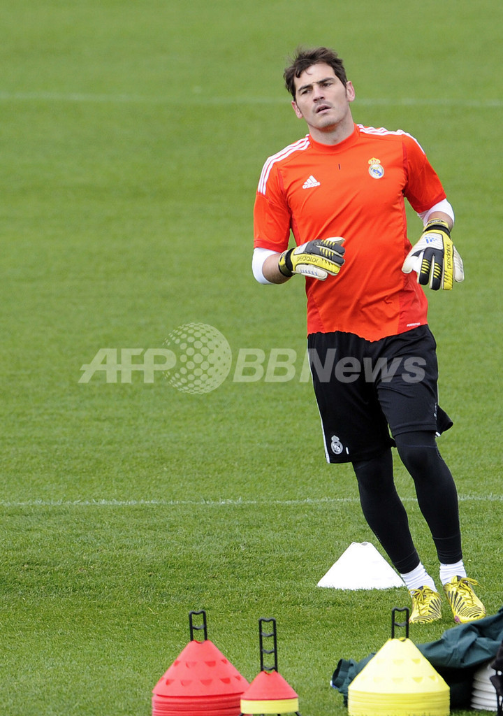 トレーニングに臨むレアル・マドリードのイケル・カシージャス(Iker Casillas、2013年4月29日撮影)。(c)AFP/DOMINIQUE FAGET