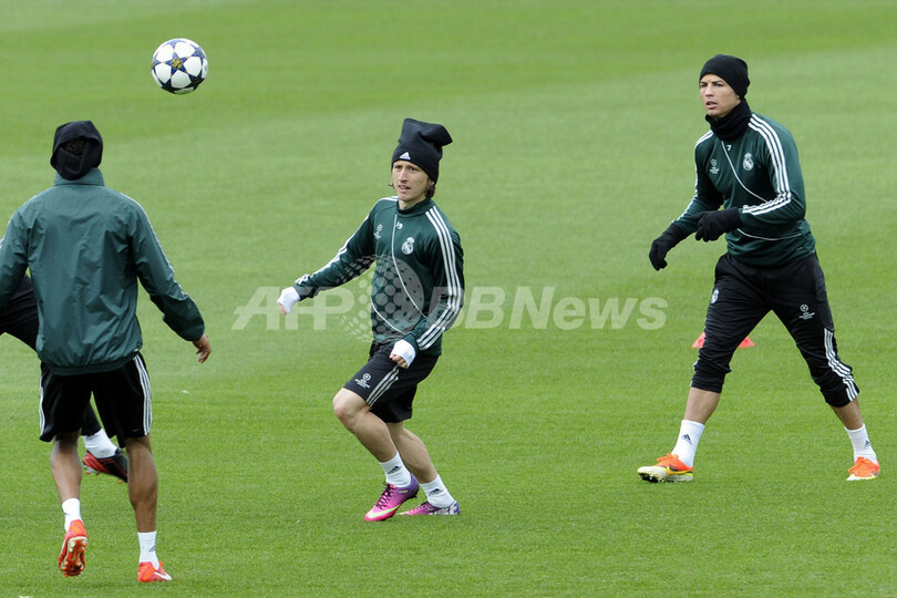 トレーニングに臨むレアル・マドリードのルカ・モドリッチ(Luka Modric、中央)、クリスティアーノ・ロナウド(Cristiano Ronaldo、右)ら(2013年4月29日撮影)。(c)AFP/DOMINIQUE FAGET
