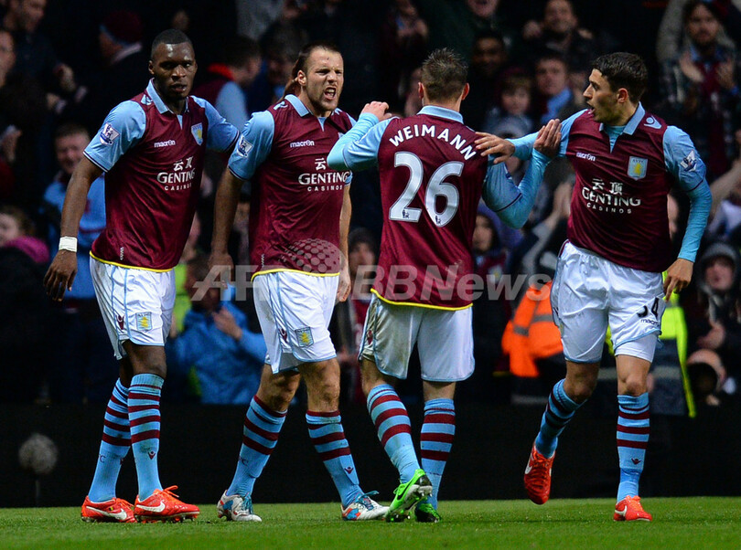 前半31分にロン・フラール(Ron Vlaar、左から2人目)が決めた先制点を喜ぶアストン・ビラの選手(2013年4月29日撮影)。(c)AFP/ANDREW YATES
