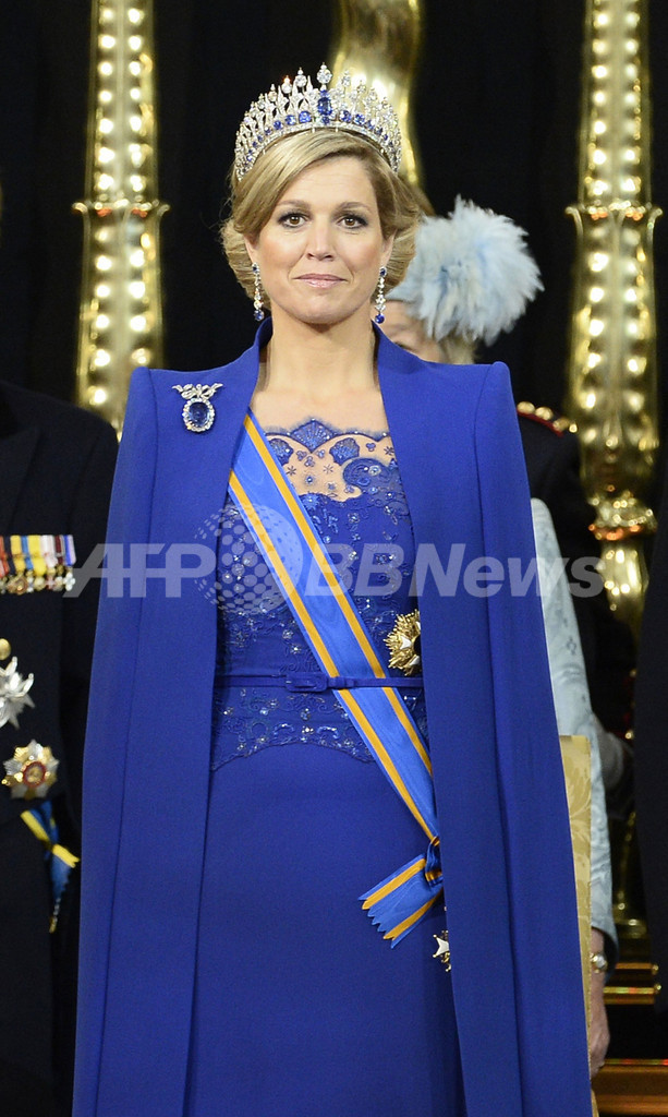 写真は、首都アムステルダム(Amsterdam)のアムステルダム新教会(Nieuwe Kerk)で行われたアレクサンダー新国王の即位式に臨むマキシマ新王妃(2013年4月30日撮影)。(c)AFP/ROBIN UTRECHT