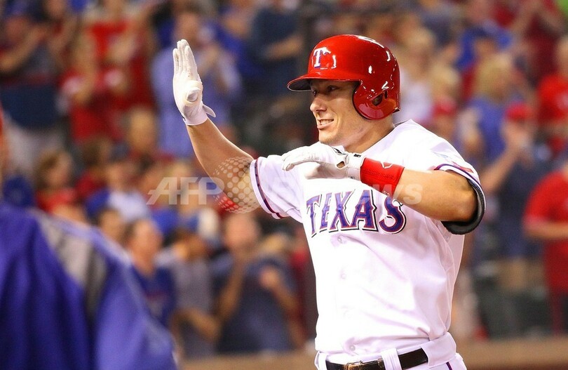 4回にソロ本塁打を放ち、歓喜するテキサス・レンジャーズのジェフ・ベイカー(Jeff Baker、2013年4月30日撮影)。(c)AFP/Getty Images/Rick Yeatts