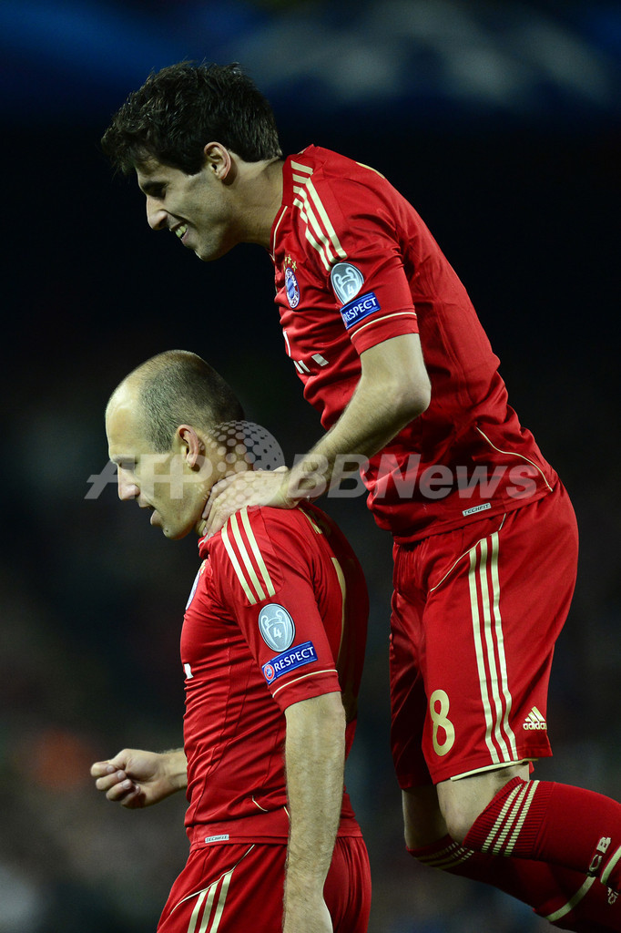 後半4分に先制点を挙げたアリエン・ロッベン(Arjen Robben)を祝福するバイエルン・ミュンヘンの ハビエル・マルティネス(Javier Martinez Aginaga、2013年5月1日撮影)。(c)AFP/JAVIER SORIANO