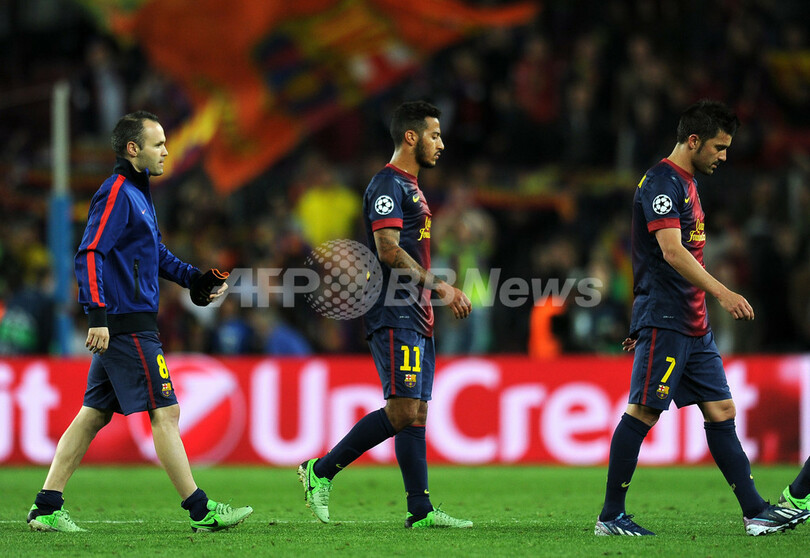 試合に敗れ、落胆した様子でピッチを後にするFCバルセロナの選手(2013年5月1日撮影)。(c)AFP/LLUIS GENE