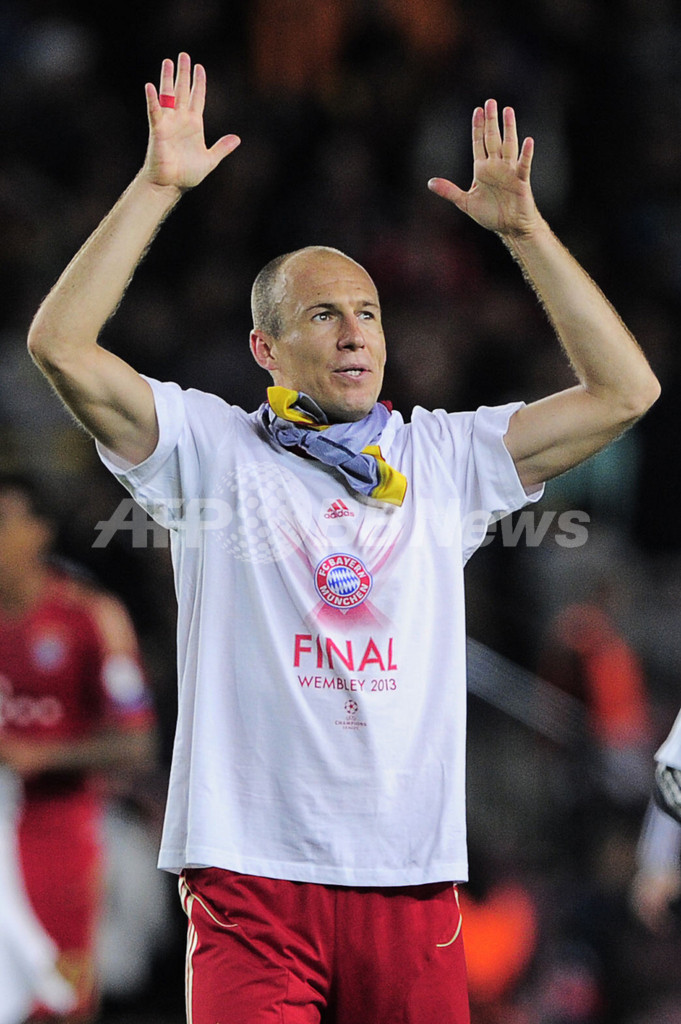 試合に勝利し、観衆の声援に応えるバイエルン・ミュンヘンのアリエン・ロッベン(Arjen Robben、2013年5月1日撮影)。(c)AFP/LLUIS GENE