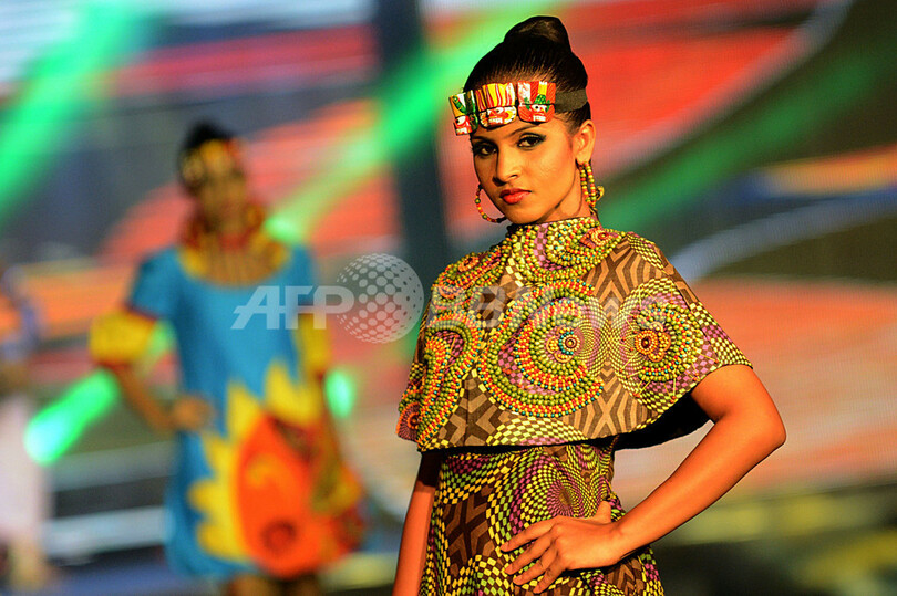 戦争で親を亡くした子どもたちの支援を目的に運営する団体「Viru Daru」とランカ・ファッション専門学校(Lanka Institute of Fashion Technology、LIFT)が開催したイベントで、ランウェイには、地元ダンサーも登場しパフォーマンスも披露された。(c)AFP