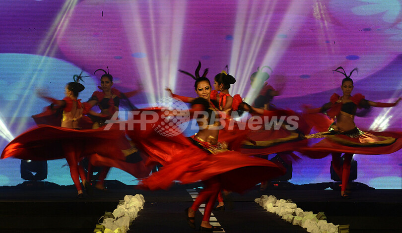 戦争で親を亡くした子どもたちの支援を目的に運営する団体「Viru Daru」とランカ・ファッション専門学校(Lanka Institute of Fashion Technology、LIFT)が開催したイベントで、ランウェイには、地元ダンサーも登場しパフォーマンスも披露された。(c)AFP