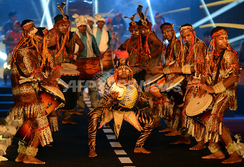 戦争で親を亡くした子どもたちの支援を目的に運営する団体「Viru Daru」とランカ・ファッション専門学校(Lanka Institute of Fashion Technology、LIFT)が開催したイベントで、ランウェイには、地元ダンサーも登場しパフォーマンスも披露された。(c)AFP