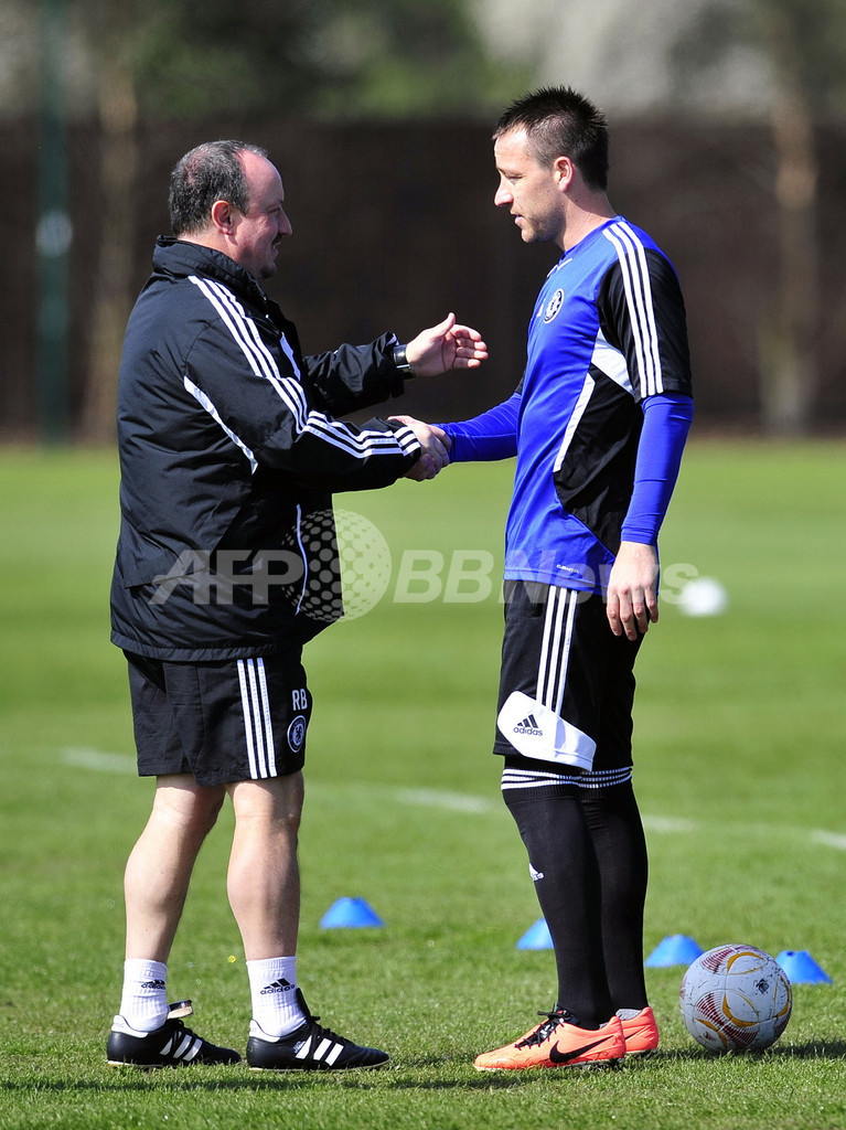 調整中にジョン・テリー(John Terry、右)と握手を交わすチェルシーのラファエル・ベニテス(Rafael Benitez)暫定監督(2013年5月1日撮影)。(c)AFP/GLYN KIRK