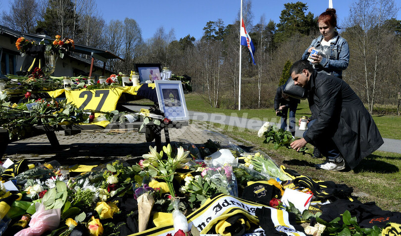 スウェーデン・ストックホルム(Stockholm)にあるAIKソルナの施設で献花するファン(2013年5月2日撮影)。(c)AFP/JONATHAN NACKSTRAND
