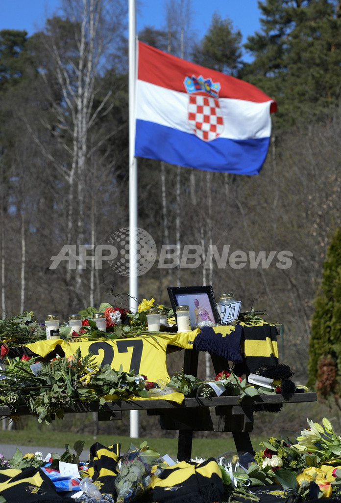 スウェーデン・ストックホルム(Stockholm)にあるAIKソルナの施設で献花するファン(2013年5月2日撮影)。(c)AFP/JONATHAN NACKSTRAND