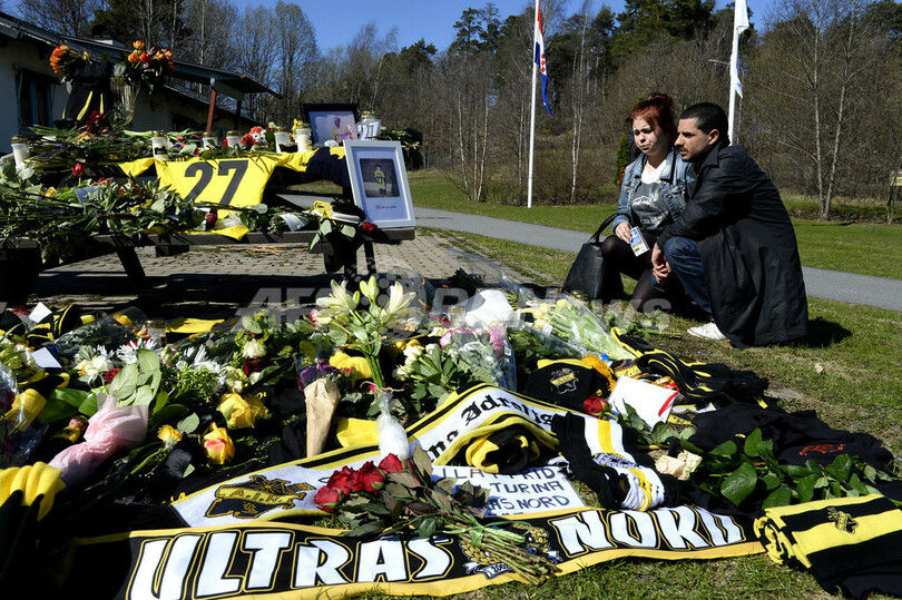 スウェーデン・ストックホルム(Stockholm)にあるAIKソルナの施設で献花するファン(2013年5月2日撮影)。(c)AFP/JONATHAN NACKSTRAND