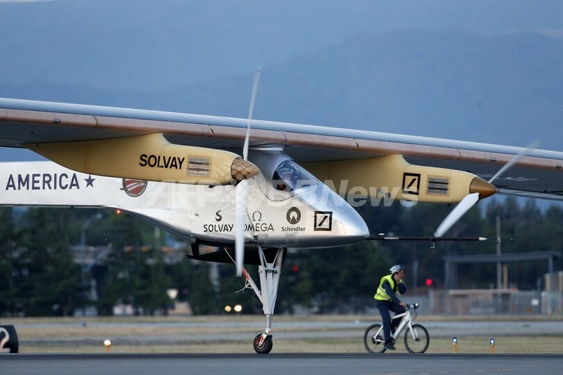 写真は、同州マウンテンビュー(Mountain View)にある米航空宇宙局(NASA)エイムズ研究センター(Ames Research Center)のモフェット飛行場(Moffett Field)から離陸するソーラー・インパルス(2013年5月3日撮影)。(c)AFP/Getty Images/Beck Diefenbach