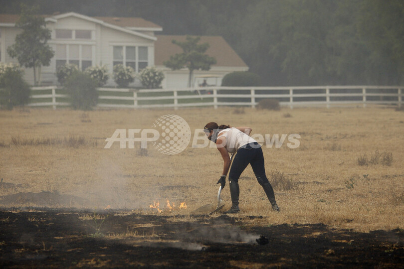 写真は、カマリロ(Camarillo)で飛び火を消そうとする女性(2013年5月3日撮影)。(c)AFP/Getty Images/David McNew
