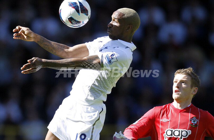 ボールをコントロールするトッテナム・ホットスパーのジャーメイン・デフォー(Jermain Defoe、左、2013年5月4日撮影)。(c)AFP/IAN KINGTON