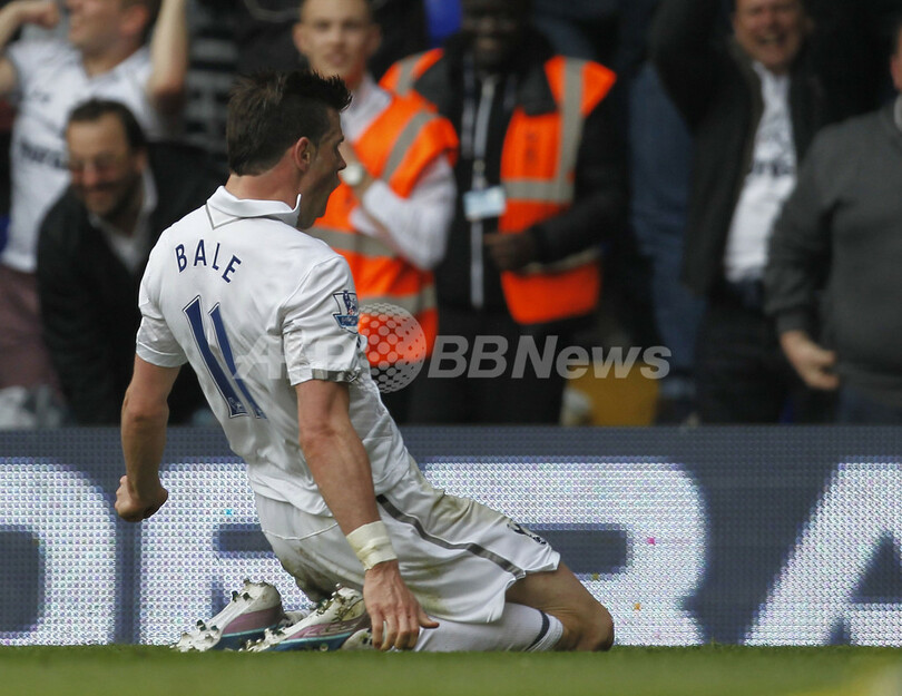 後半41分に得点を決め歓喜するトッテナム・ホットスパーのギャレス・ベイル(Gareth Bale、2013年5月4日撮影)。(c)AFP/IAN KINGTON