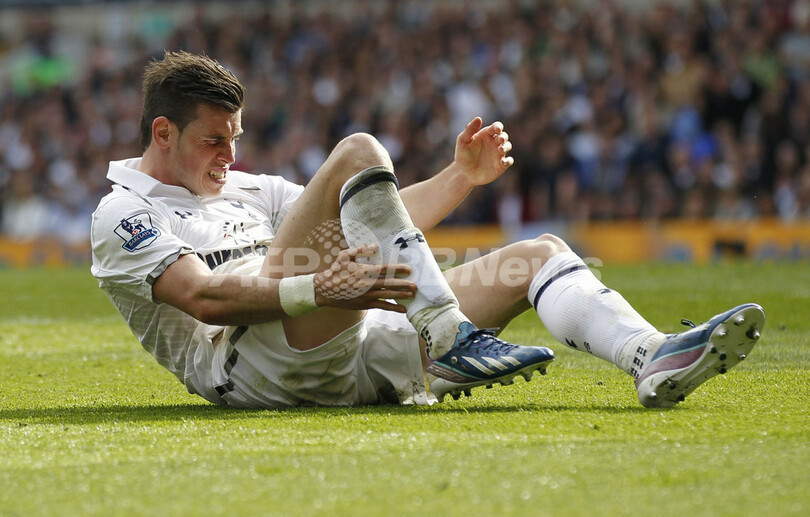 タックルを受け倒れ込むトッテナム・ホットスパーのギャレス・ベイル(Gareth Bale、2013年5月4日撮影)。(c)AFP/IAN KINGTON