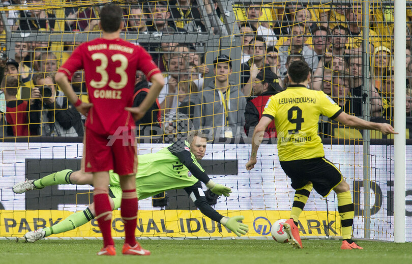 ボルシア・ドルトムントのロベルト・レワンドフスキ(Robert Lewandowski、右)のPKを止めるバイエルン・ミュンヘンのGKマヌエル・ノイアー(Manuel Neuer、中央、2013年5月4日撮影)。(c)AFP/ODD ANDERSEN