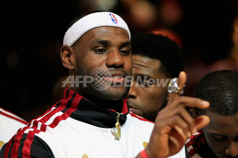 授与された11-12シーズンNBAファイナルのチャンピオンリングを見つめるレブロン・ジェームズ(2012年10月30日撮影)。(c)AFP/Getty Images/Chris Trotman