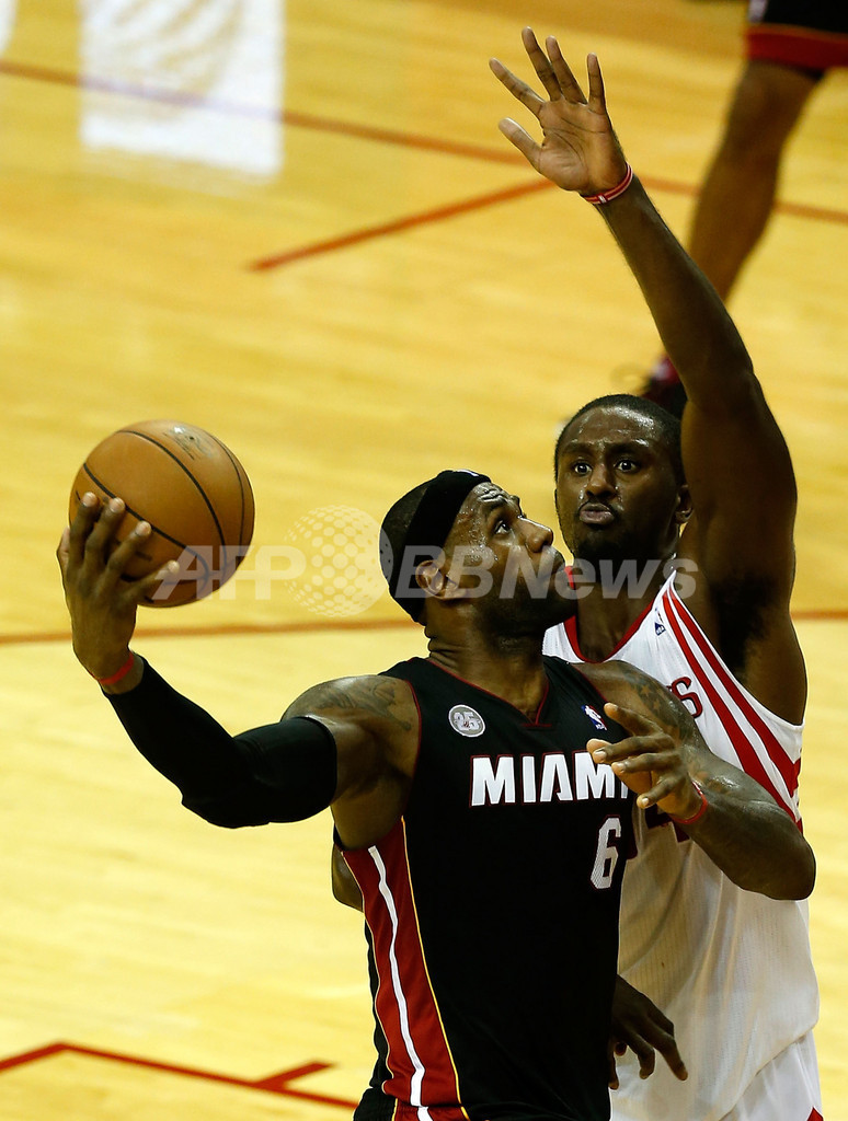 ヒューストン・ロケッツのパトリック・パターソン (Patrick Patterson、右)にドライブを仕掛けるレブロン・ジェームズ(2012年11月12日撮影)。(c)AFP/Getty Images/Scott Halleran