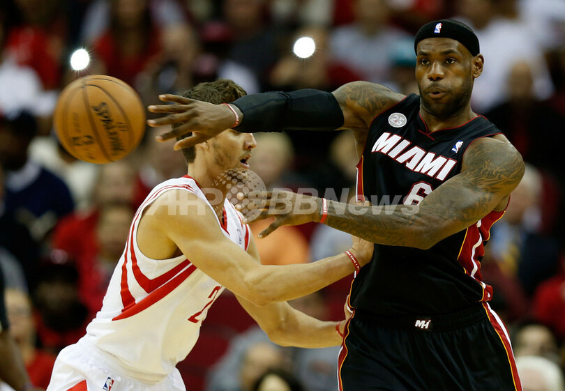 ヒューストン・ロケッツのチャンドラー・パーソンズ(Chandler Parsons、左)を引き付けてパスを出すレブロン・ジェームズ(2012年11月12日撮影)。(c)AFP/Getty Images/Scott Halleran