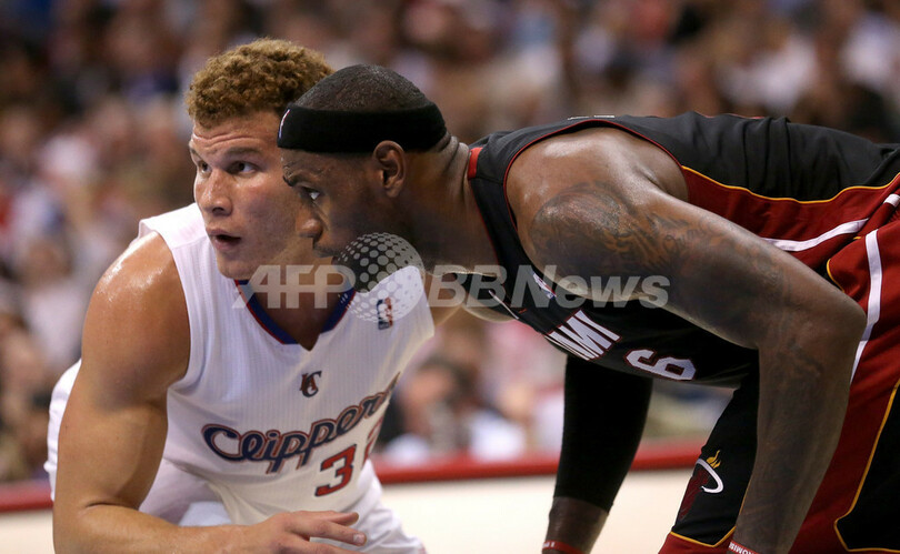 ロサンゼルス・クリッパーズのブレイク・グリフィン(Blake Griffin、左)とのポジション争いに備えるレブロン・ジェームズ(2012年11月14日撮影)。(c)AFP/Getty Images/Stephen Dunn