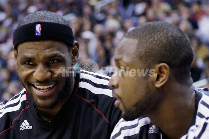 チームメイトのドウェイン・ウェイド(Dwyane Wade、右)と談笑するレブロン・ジェームズ(2012年12月4日撮影)。(c)AFP/Getty Images/Rob Carr