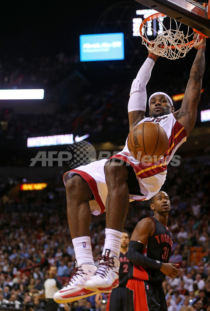 ダンクシュートを決めるレブロン・ジェームズ(2013年1月23日撮影)。(c)AFP/Getty Images/Mike Ehrmann