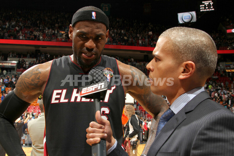 試合後にインタビューを受けるレブロン・ジェームズ(2013年3月6日撮影)。(c)AFP/Getty Images/NBAE/Issac Baldizon