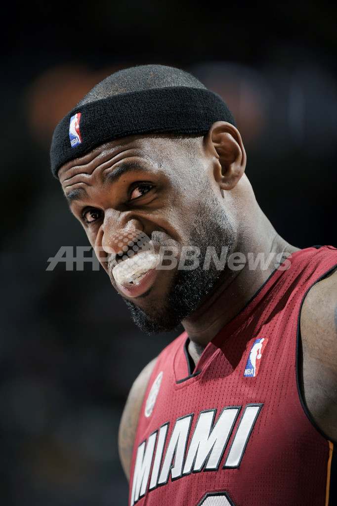 マウスピースをくわえるレブロン・ジェームズ(2013年3月20日撮影)。(c)AFP/Getty Images/NBAE/Liam Kyle