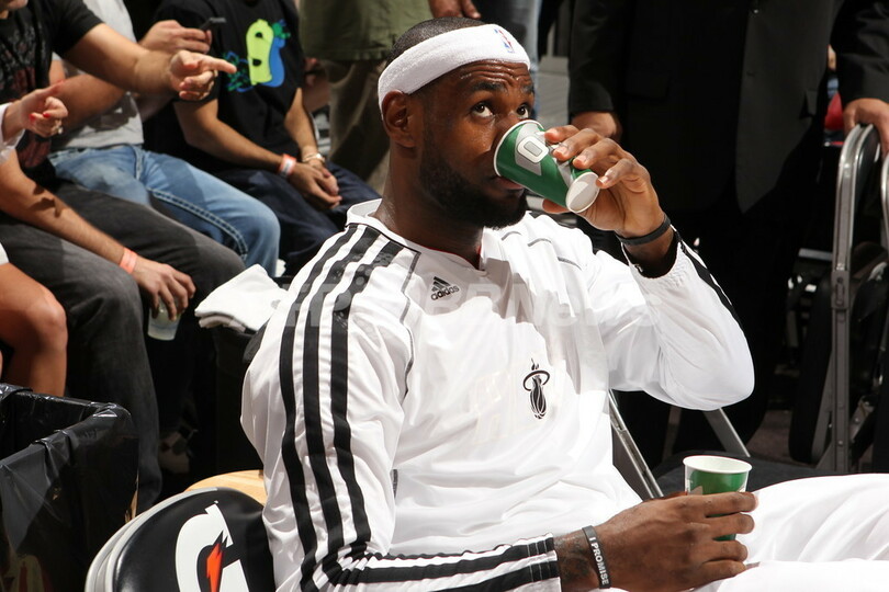 試合前のベンチで水分を補給するレブロン・ジェームズ(2013年3月24日撮影)。(c)AFP/Getty Images/NBAE/Issac Baldizon