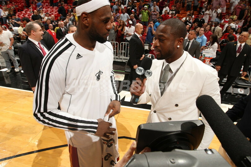 試合後にドウェイン・ウェイド(Dwyane Wade、右)のインタビューを受けるレブロン・ジェームズ(2013年3月24日撮影)。(c)AFP/Getty Images/NBAE/Issac Baldizon
