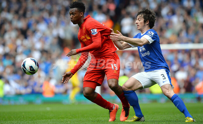 エバートンのレイトン・ベインズ(Leighton Baines、右)と競り合いボールを追うリバプールのダニエル・スターリッジ(Daniel Sturridge、2013年5月5日撮影)。(c)AFP/PAUL ELLIS